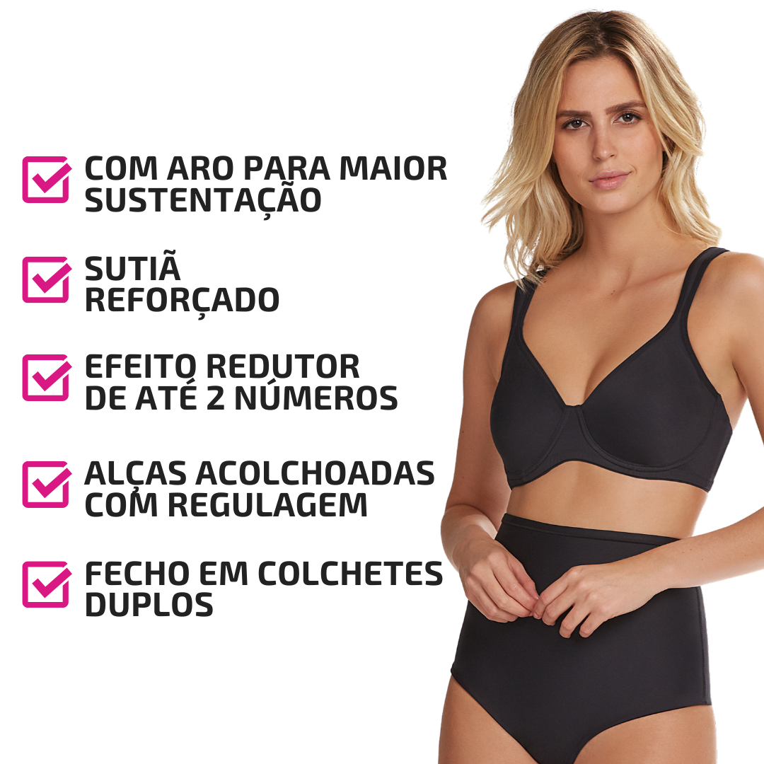 O Sutiã para diminuir o volume dos seios. Barbatanas laterais e costas largas com acabamentos em elástico reforçado, proporcionam maior firmeza, mas sem deixar o conforto de lado. As alças são acolchoadas para maior conforto e alívio do peso aos ombros. Sutiã sem Bojo com Aro.